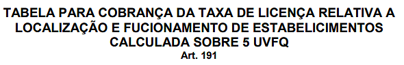 TABELA PARA COBRANÇA DA TAXA DE LICENÇA RELATIVA A VEICULAÇÃO DE PUBLICIDADE EM GERAL CALCULADA SOBRE 5 UVFQ Art.210++++++++++ | |||