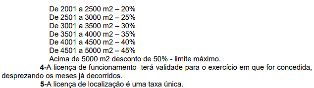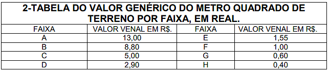 | 4 - Publicidade colocada em terrenos, campos de esportes, clubes, associações, qualquer que seja o sistema de colocação, desde que visível de quaisquer vias ou logradouros públicos, inclusive as rodovias, estradas e caminhos municipais por m2. | 0,5% | 1% | 4% |