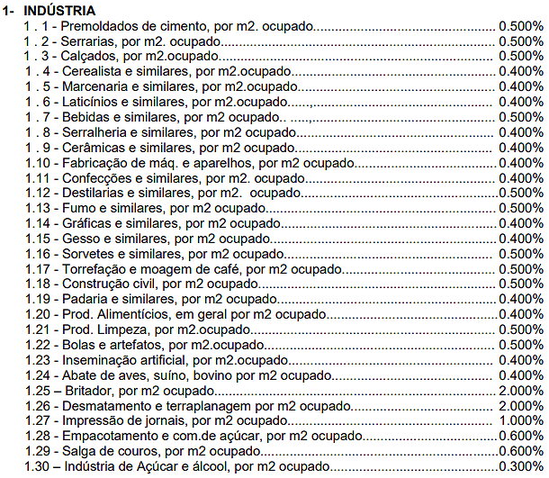 Indústria.....................................................0,30% por m2