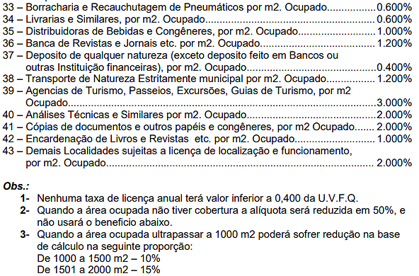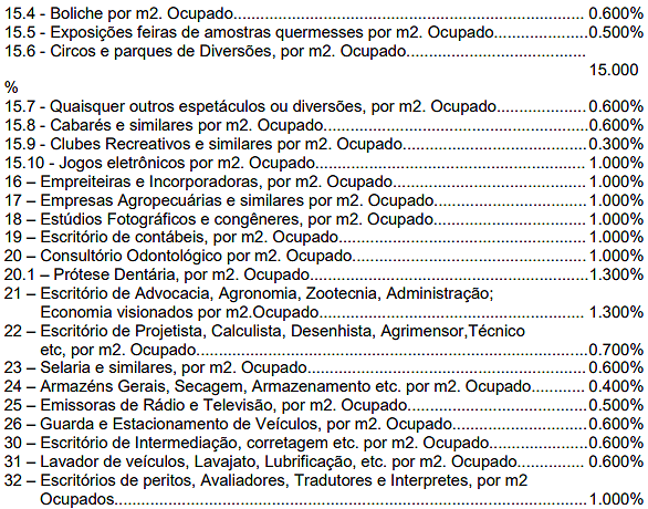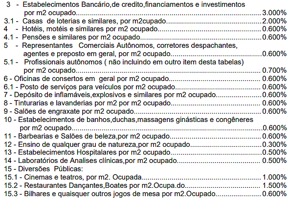 | 04 | Bancas em geral, por metro quadrado ou fração, | 0,10 | 0,40 | 2,00 |