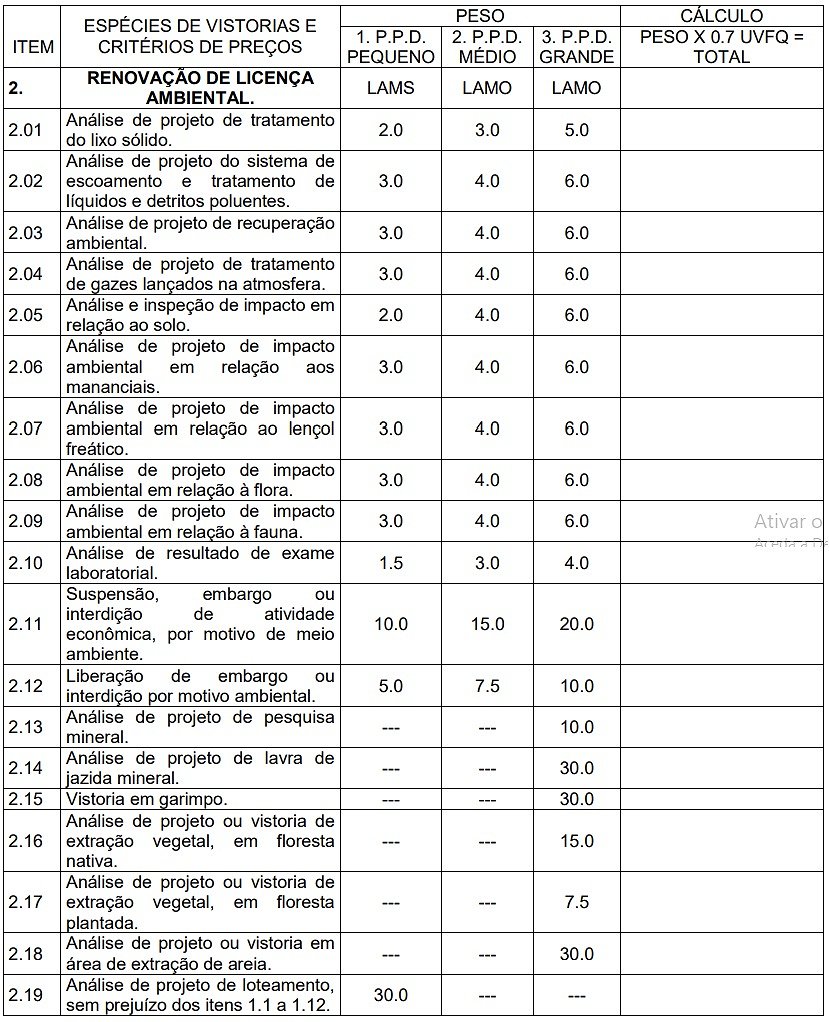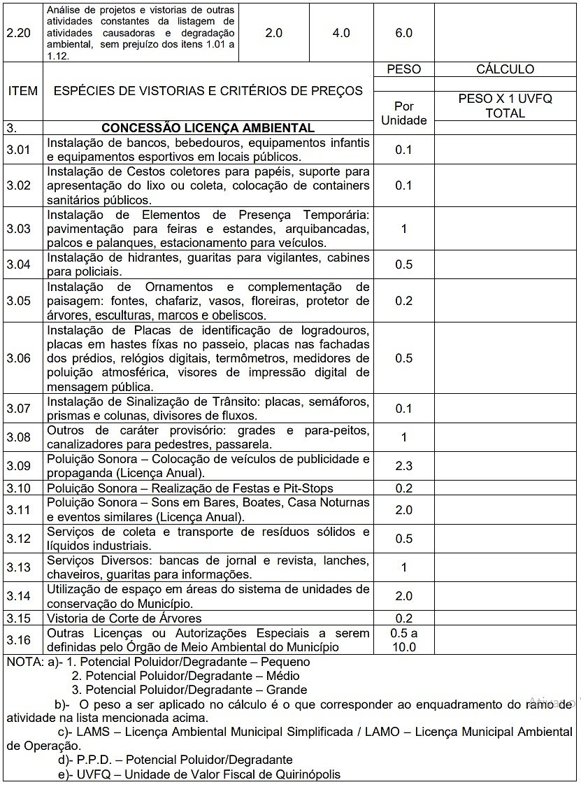 | 02 | Comércio em feiras Livres. | 0,10 | 0,40 | 2,00 |